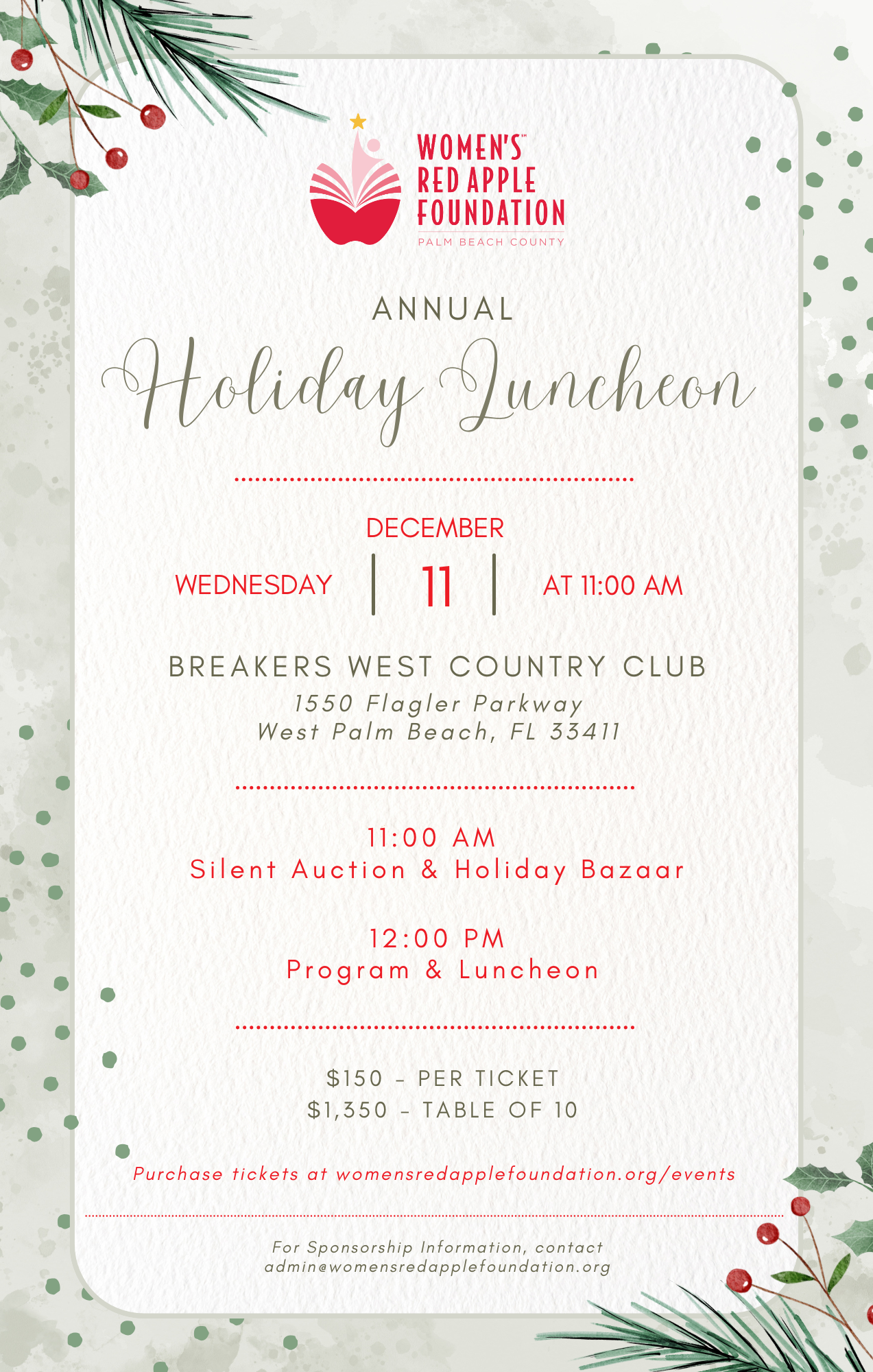 Please join us for our Annual Holiday Luncheon, Silent Auction, and Holiday Bazaar on Wednesday, December 11th at the Breaker’s West Country Club!