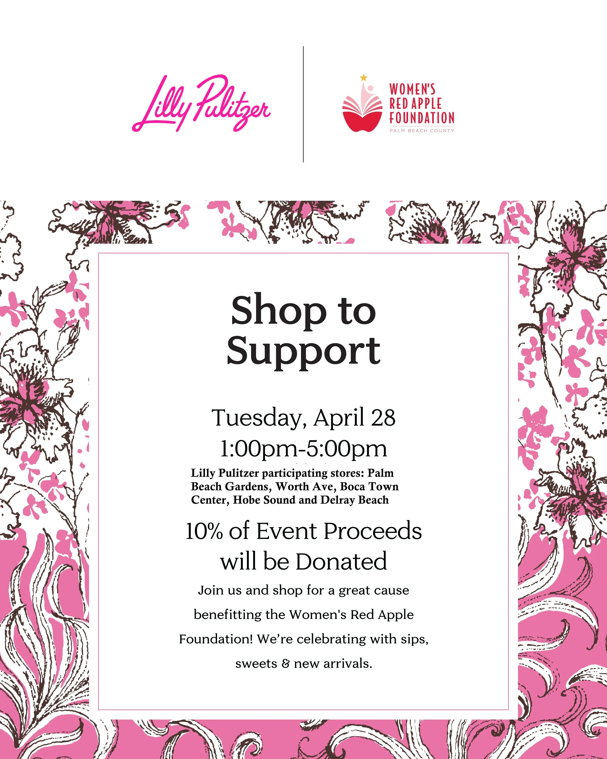 Please join us for a Shop to Support event at Lilly Pultizer at on Tuesday, April 28th from 1:00pm - 5:00pm! Shop at any of the participating stores: Palm Beach Gardens, Worth Ave, Boca Town Center, Hobe Sound, and Delray Beach. 10% of event proceeds will be donated to the Foundation.