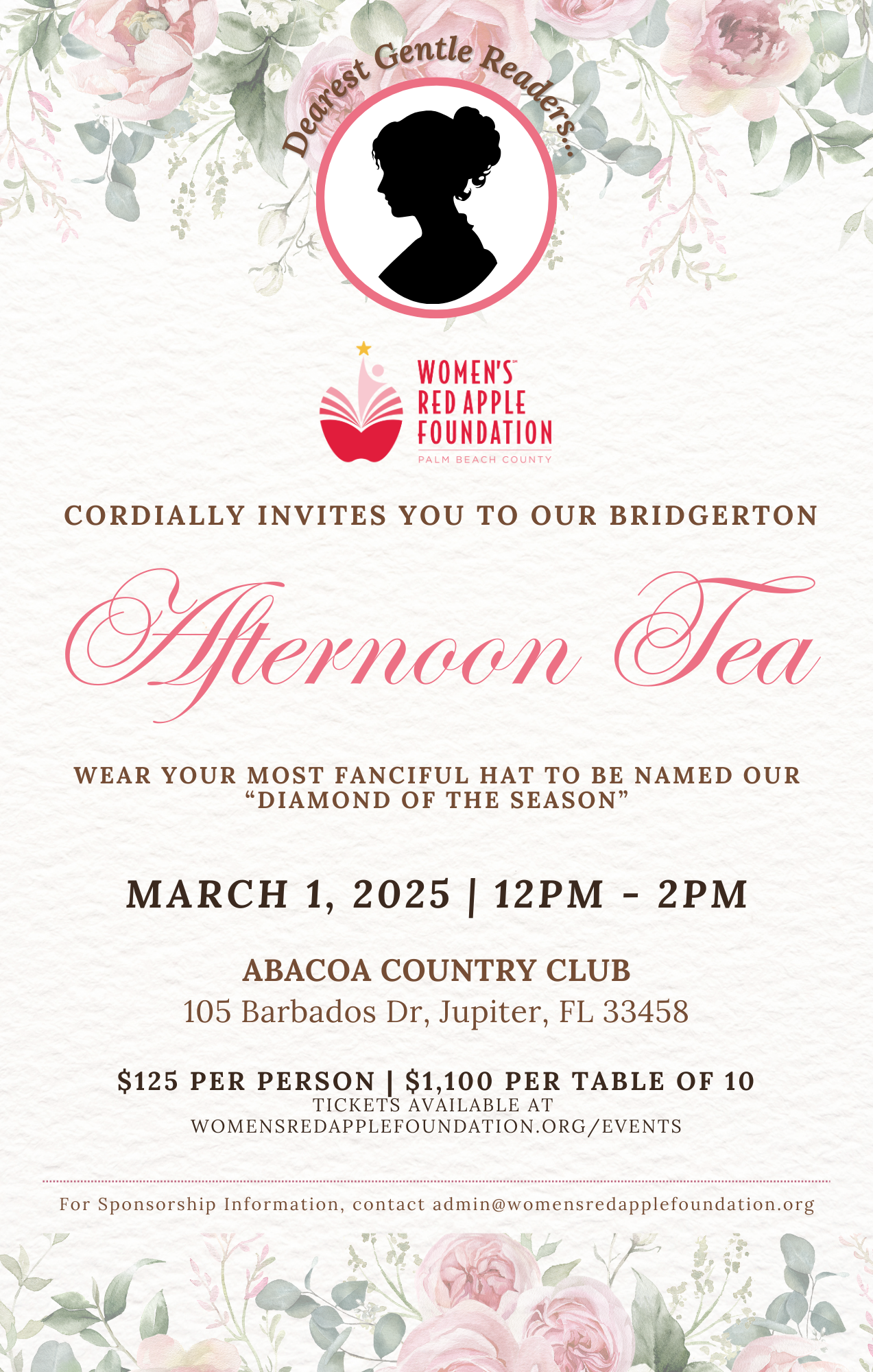 Back to All Events Afternoon Tea Saturday, March 1, 2025 12:00 PM 2:00 PM Abacoa Golf Club 105 Barbados Drive Jupiter, FL, 33458 United States (map) Google Calendar ICS Dearest Gentle Readers,The Women’s Red Apple Foundation Cordially invites you to our Bridgerton Afternoon Tea on March 1st, 2025. Join us at the Abacoa County Club in Jupiter and wear your most fanciful hat to be named our “Diamond of the Season”!