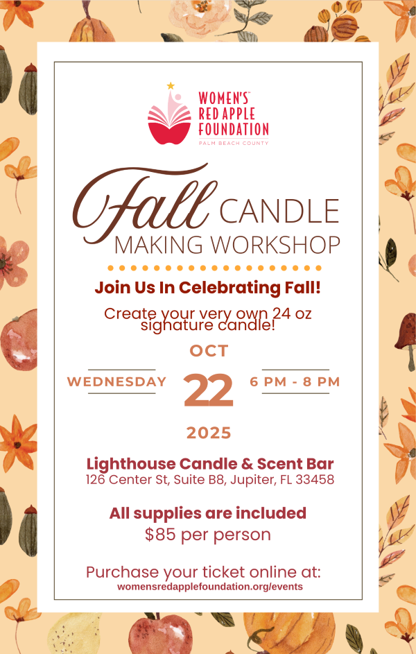 Back to All Events 2025 Fall Candle Making Workshop Wednesday, October 22, 2025 6:00 PM 8:00 PM Lighthouse Candle & Scent Bar 126 Center Street, Suite B-8 Jupiter, FL 33458 United States (map) Google Calendar ICS Fall Candle Making WorkshopJoin Us in Celebrating Fall! Create your very own 24 oz Signature Candle! Register Now